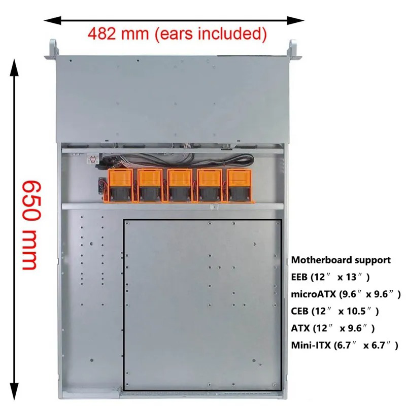 1U Server Chassis: | 650 (D)*482 (W)*44 (H) mm; 25.5*19*1.7 inch | |