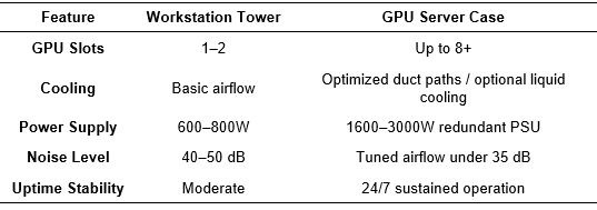 A good GPU server case is less about aesthetics and more about airflow, stability, and scalability. It’s the quiet enabler that keeps GPUs running at peak performance while preventing thermal throttling — something standard desktop cases just can’t do for long renders.