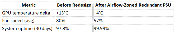 But what made this setup valuable wasn’t only redundancy — it was how maintainable it became. Technicians could hot-swap the failed PSU from the front panel without pulling the chassis out of the rack. That single improvement cut mean time to repair (MTTR) by over 80%.