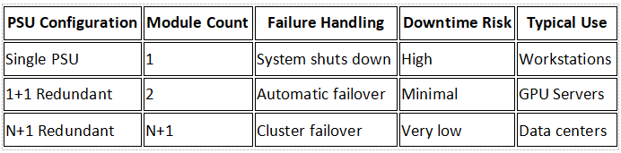 In the same way, a 1+1 or N+1 redundant PSU keeps your GPUs running even if one module fails. The backup instantly takes over the power load — no reboot, no data loss, no panic at 2 a.m.