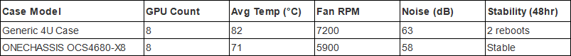 Here’s a quick comparison from our own internal tests between two 4U cases using the same eight-GPU setup: